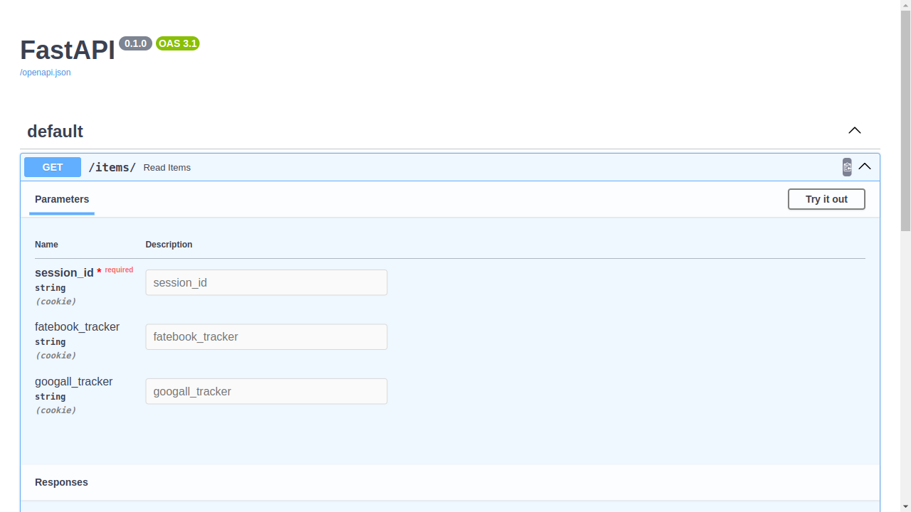 But even if you fill the data and click "Execute", because the docs UI works with JavaScript, the cookies won't be sent, and you will see an error message as if you didn't write any values.